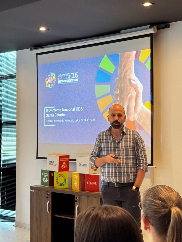 Realizada no Auditório Oikos, a capacitação contou com a presença de Rogério Simões, da UDESC Alto Vale e membro da Coordenação de Mobilização do Movimento ODS no Vale Europeu. Durante a formação, o palestrante apresentou a contextualização histórica da Agenda 2030 e os fundamentos dos ODS, destacando suas aplicações no cenário catarinense e nacional.