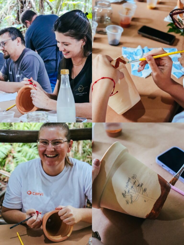 Complementando a programação, o artista plástico e assessor de Cultura do CIMVI, Marcos Alexandre de Liz, ministrou a “Oficina da Terra”. A atividade proporcionou aos colaboradores uma experiência sensorial e criativa por meio da pintura de vasos de cerâmica com tinta à base de terra, reforçando o valor do cuidado com o meio ambiente e com a comunidade.